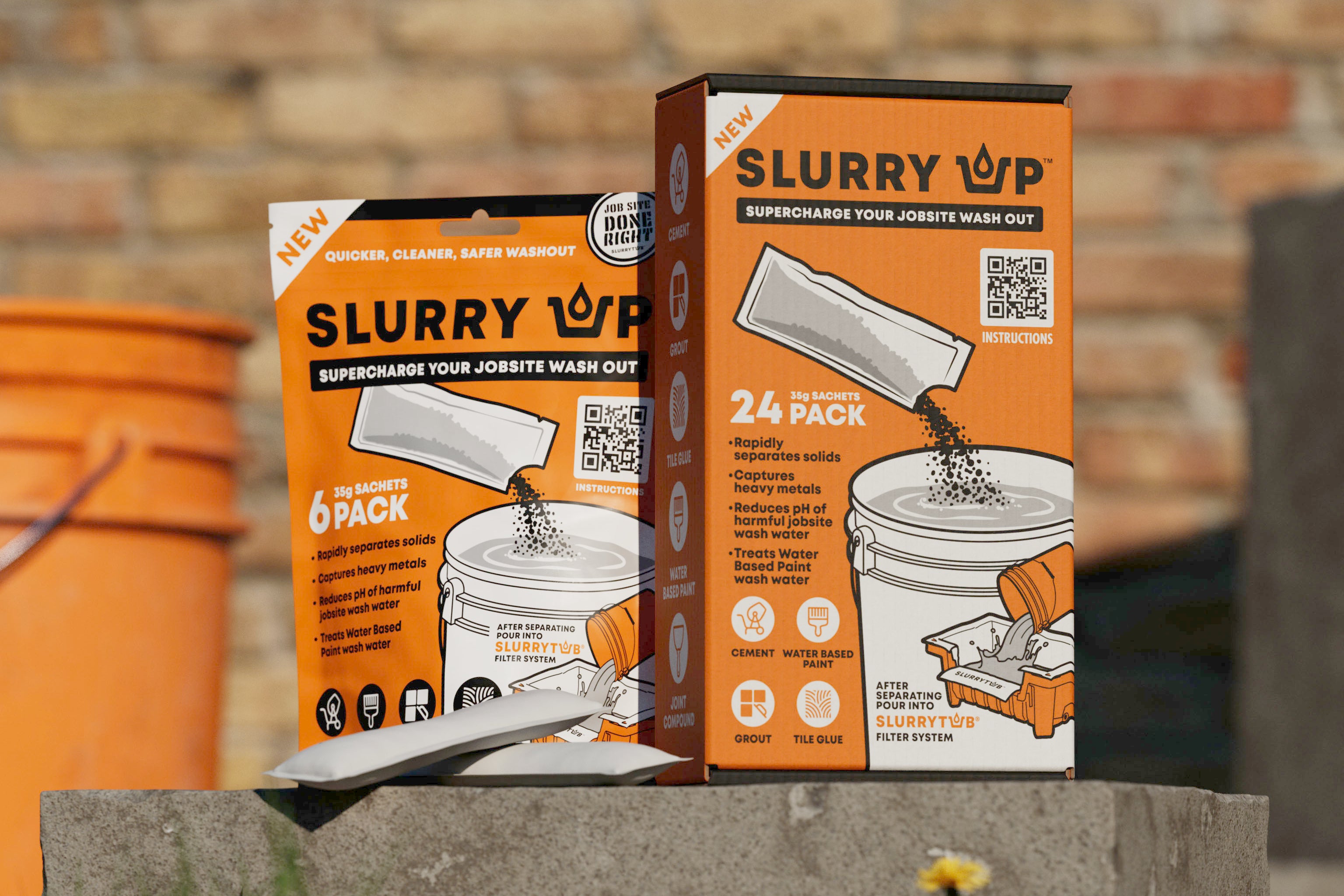 New SLURRY UP™ is a clay-based granular powder designed to deal with messy, high pH jobsite wash water. Empty a full sachet into your washout bucket, give it a stir and let SLURRY UP™ get to work. Solids bind together and drop to the bottom, pH is reduced and your waste bucket is ready to run through your SLURRYTUB® for quick filtering, cleaner work sites and easier compliance.